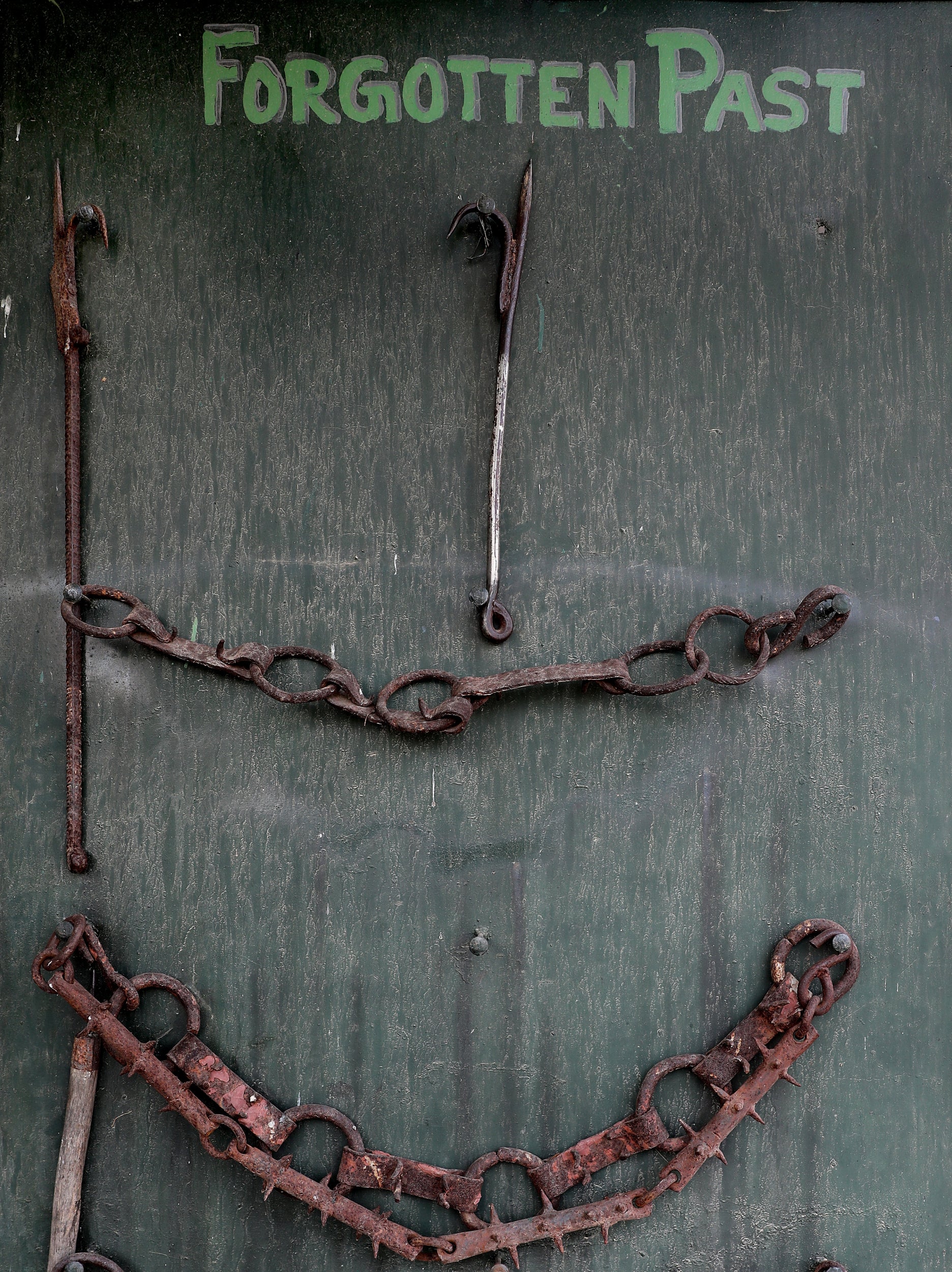 Tethering chains, iron hobbles and hooks, which were used to control captive elephants, on display