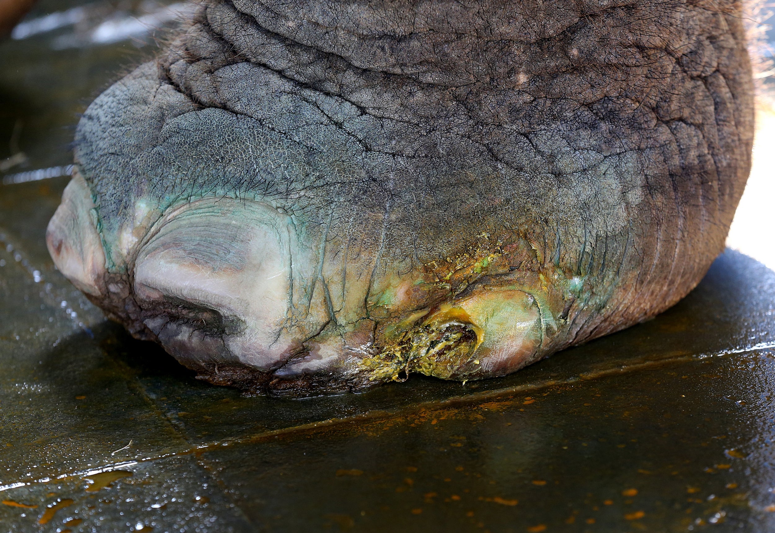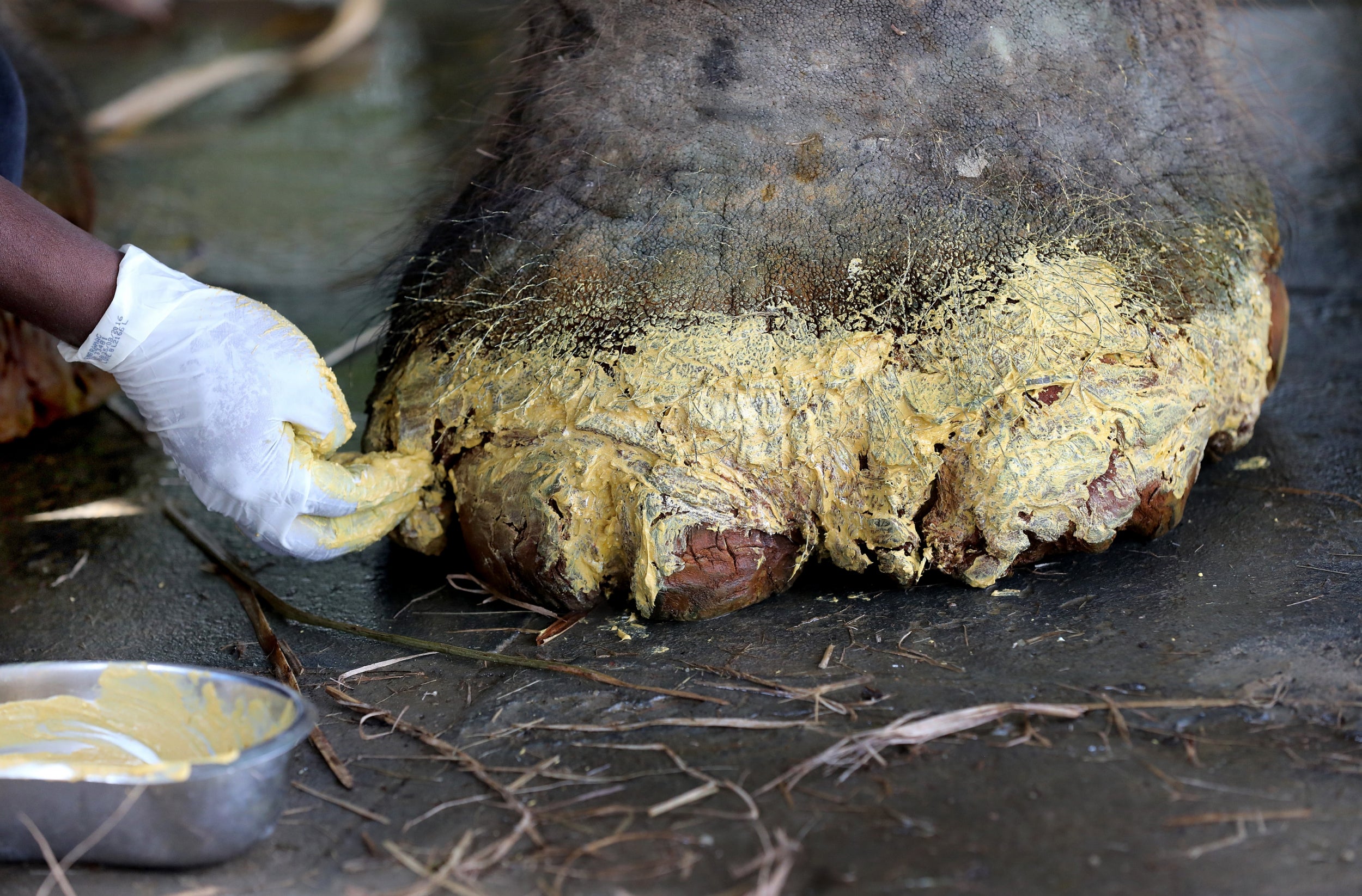 A senior veterinary officer treats an elephant with chronic foot disease and generalised infection