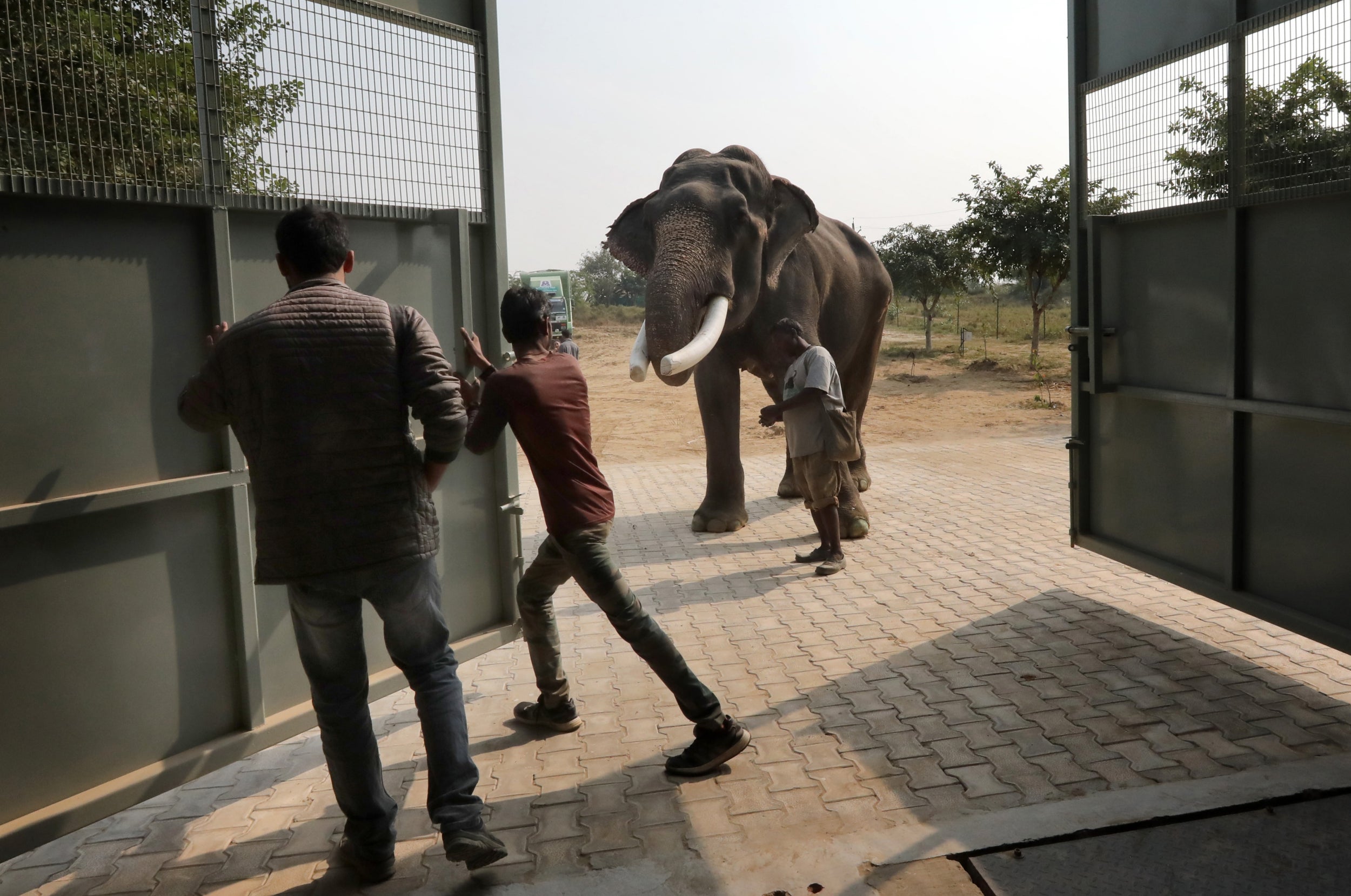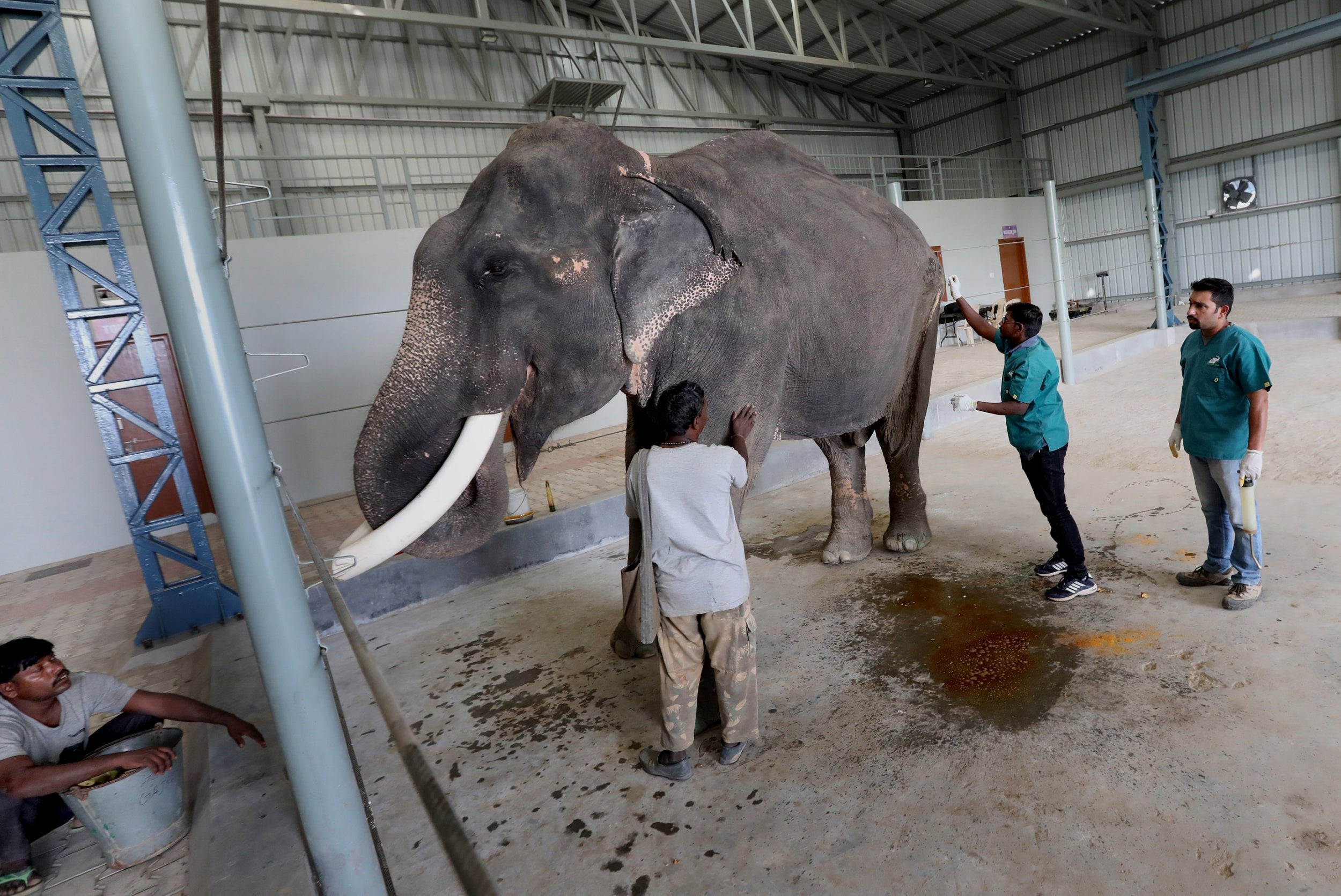 Gajraj, who was rescued from an Indian royal family, walks inside the treatment area